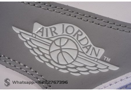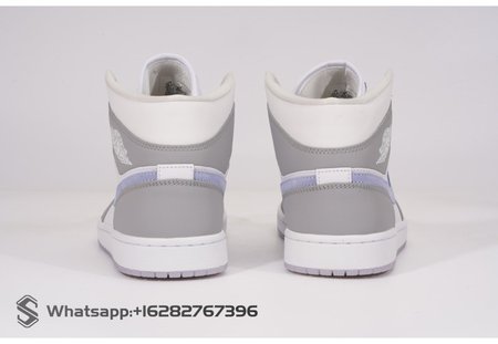 The women's Jordan 1 Mid Wolf Grey Aluminum features a white leather upper with Wolf Grey Durabuck overlays and an Aluminum Swoosh. From there, a Jumpman woven tongue label and icy translucent sole completes the design.